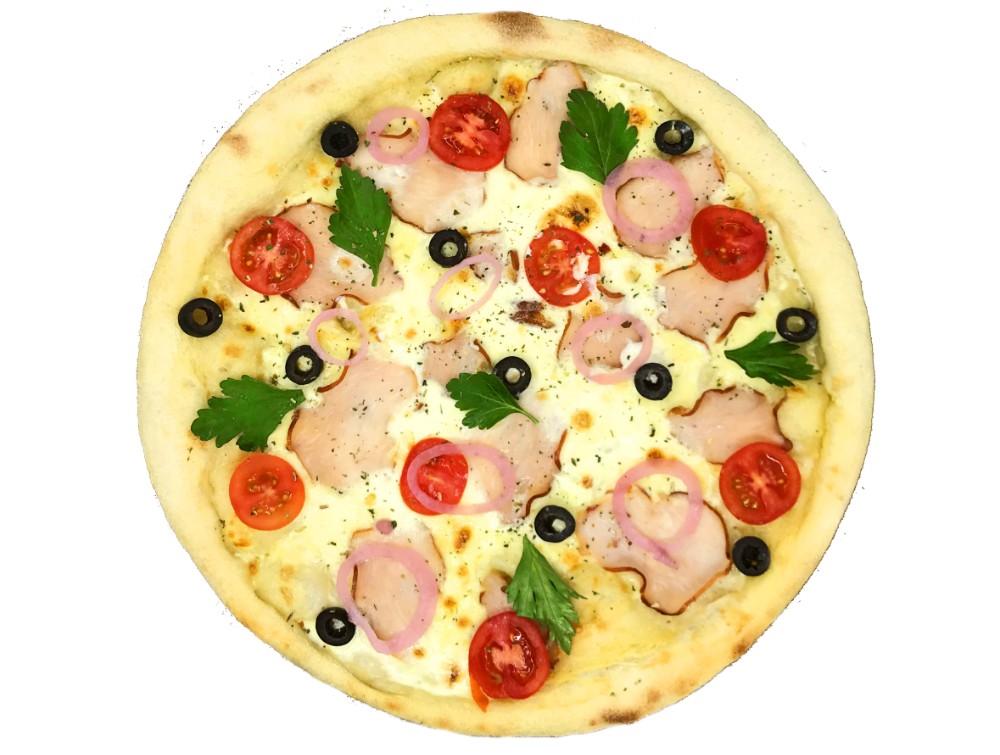 Вершковий соус, куряче філе, моцарела, маринована цибулька, помідор, маслини, пармезан, зелень