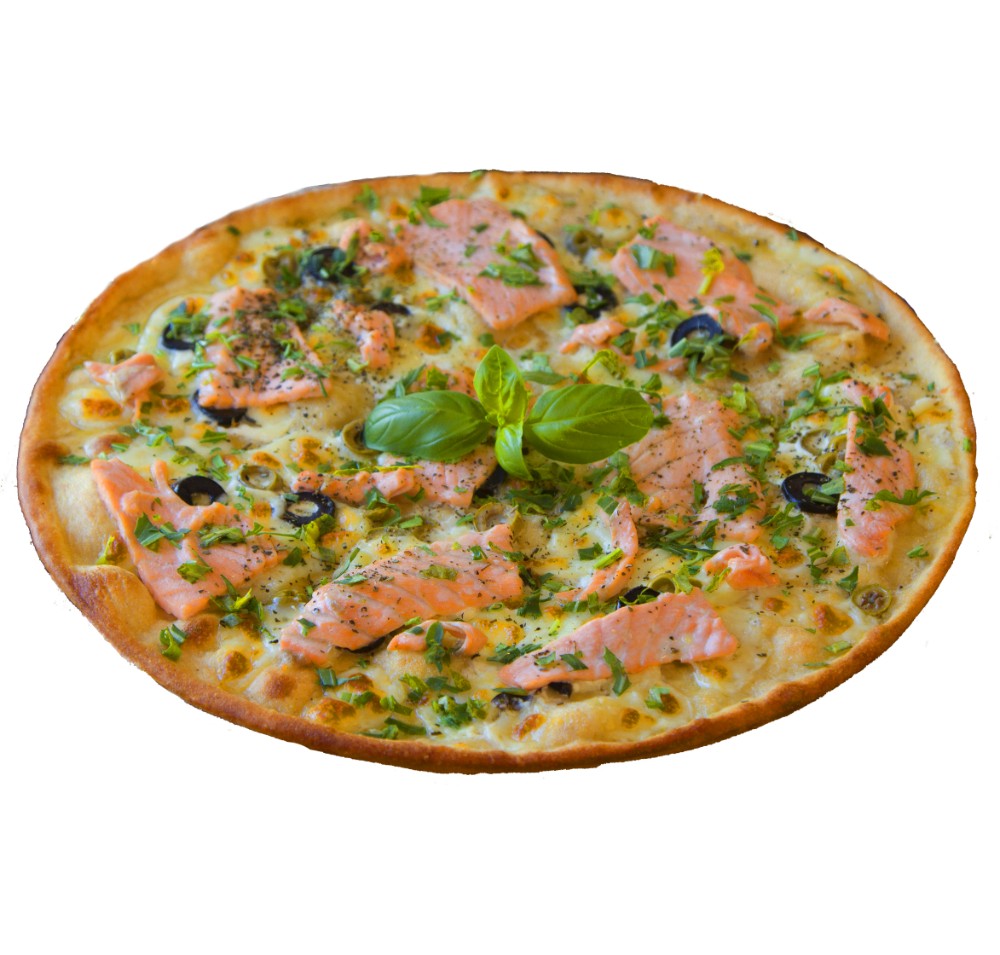 Вершковий соус, лосось, моцарела, пармезан, маслини, зелень